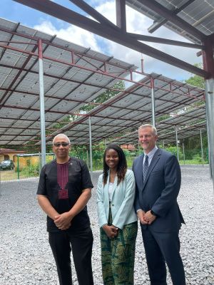 | Left to right: John Sampson, MD, IGPC; Dr. Jalikatu Mustapha, Deputy Minister of Health of Sierra Leone; and SCCM’s Mark Lenhart at the inspection of solar panel installation at Bo Government Hospital in Bo, Sierra Leone. |