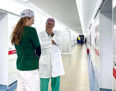 Dr. Stevens and Dr. Olha Kitsnak, resident in anesthesiology and intensive care medicine, in the ICU at the L’viv Emergency Hospital discussing patient care. |