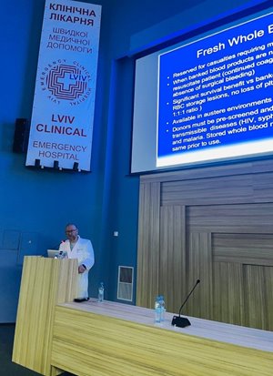 | Dr. Stevens lecturing on whole blood transfusion to the physicians of the L’viv Emergency Hospital. |