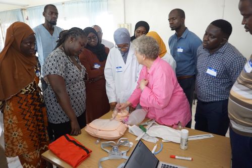 | Lauren A. Plante, MD, MPH (center) teaches intubation skills during the FCCS: OB course in the Gambia. |