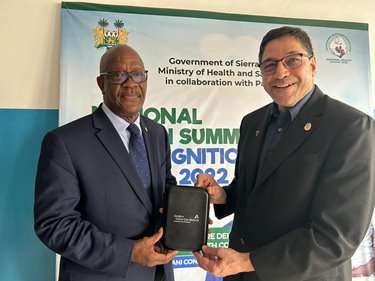 SCCM President Vinay M. Nadkarni, MD, MS, FCCM (on right), presenting an SCCM international gift to Sierra Leone Minister of Health Honorable Dr. Austin Demby. |